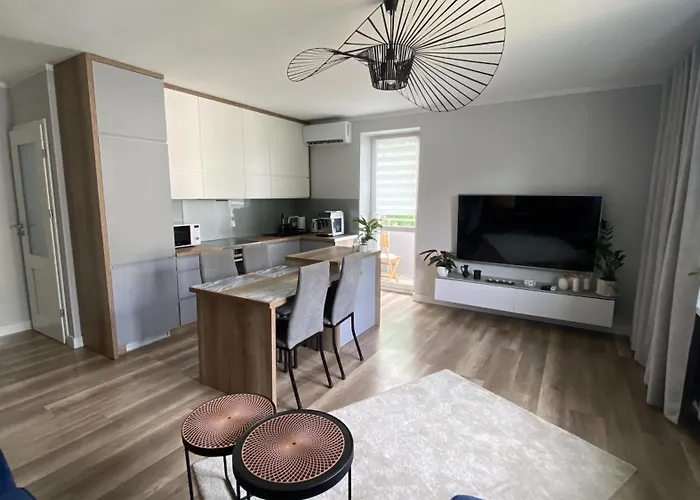 Die Unterkunft verfügt über eine Minibar und Ausstattung zur Kaffee- & Teezubereitung sowie komplette Küche mit einem Wasserkocher, einem Kühlschrank und einem Herd. Das Apartment ist nur wenige Gehminuten entfernt von der Bushaltestelle Wiadukt Pokoju.